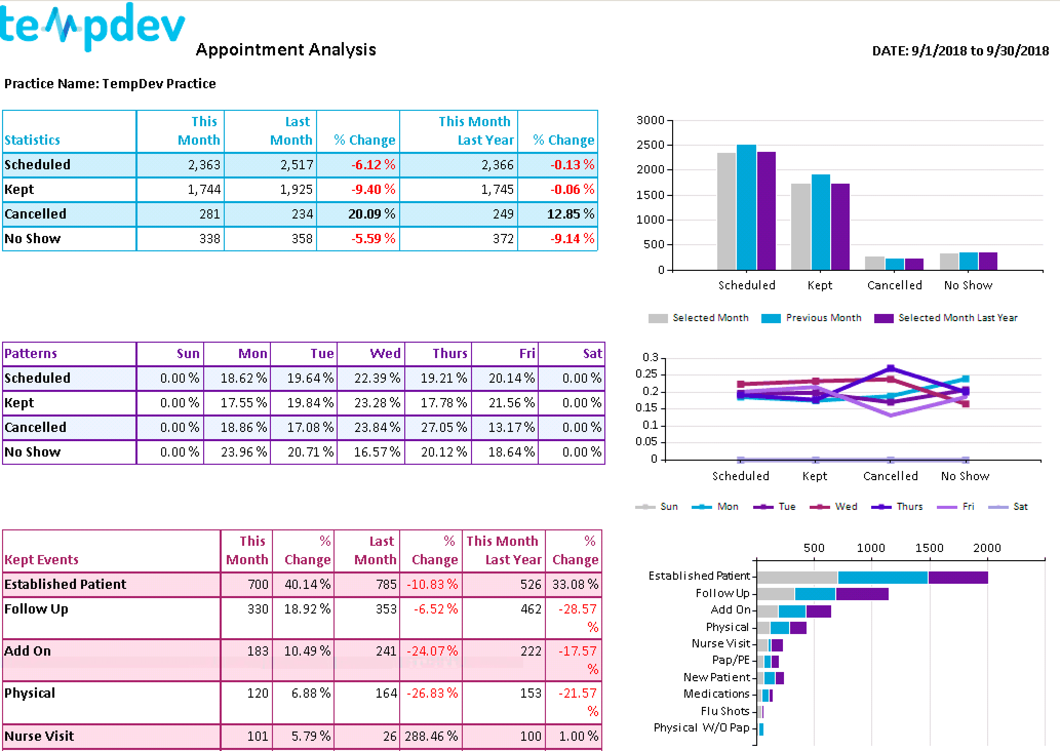 A healthy medical practice depends on several factors, but none are more important than successfully completed patient appointments. Despite your best efforts, patients often make appointments that they fail to keep. Sometimes they forget, and sometimes they simply decide not to show up. Missed appointments are a serious problem for both patient health and practice revenue. Patients risk complications from not getting or completing treatment. Providers cannot afford to have gaping holes in their daily schedules. Happily, you can improve your appointment numbers if you have the data that you need and the systems in place to raise your kept appointments ratio. With TempDev's Appointment Analysis NextGen EPM Report, you have all the information in a dashboard view to start reducing missed appointments.