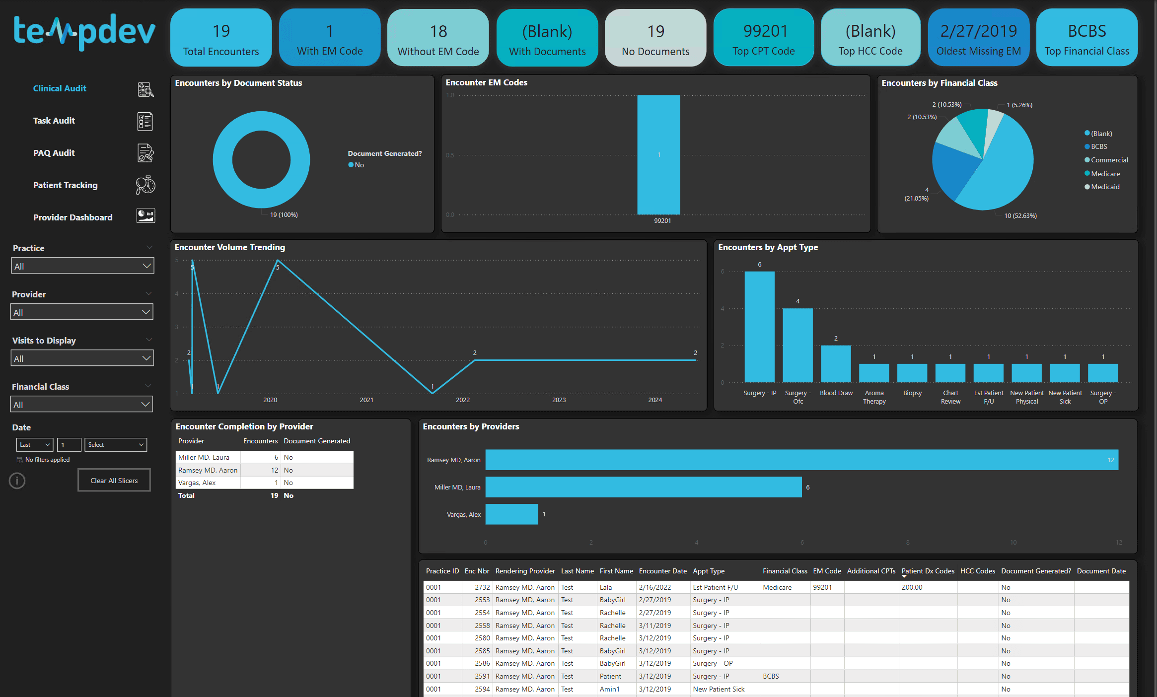 When you invest in the EHR Operations BI Dashboard, you will gain access to all the information you seek within your NextGen EHR system. This tool lets you find all the data you need in one place, giving you valuable insights into your practice's daily operations. TempDev has long helped healthcare organizations get the most out of their NextGen EHR and practice management strategies, and our latest offering is no exception.