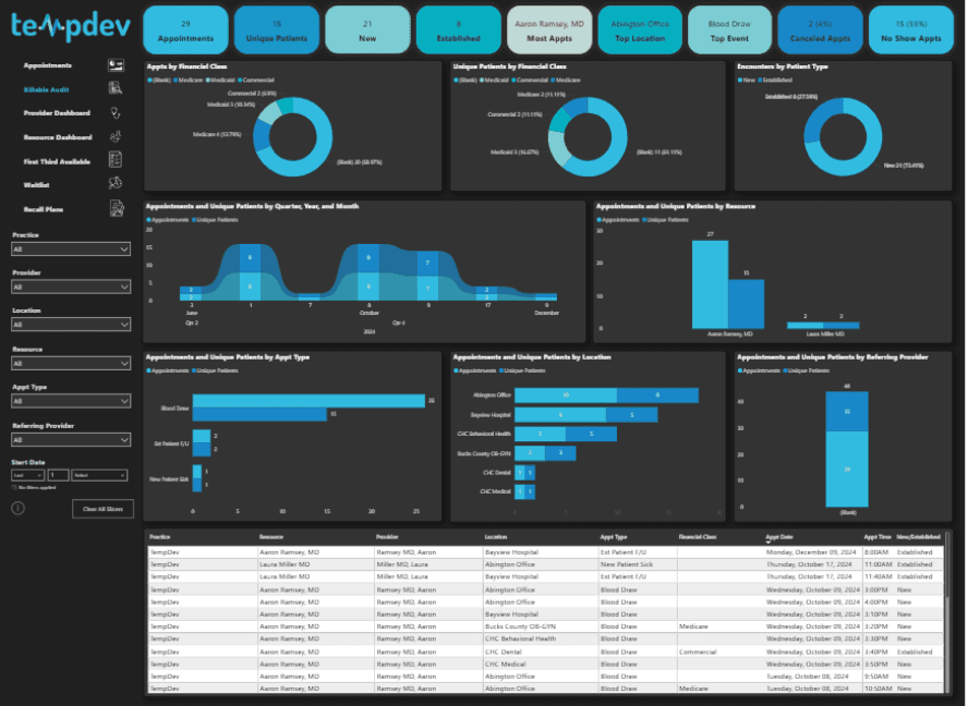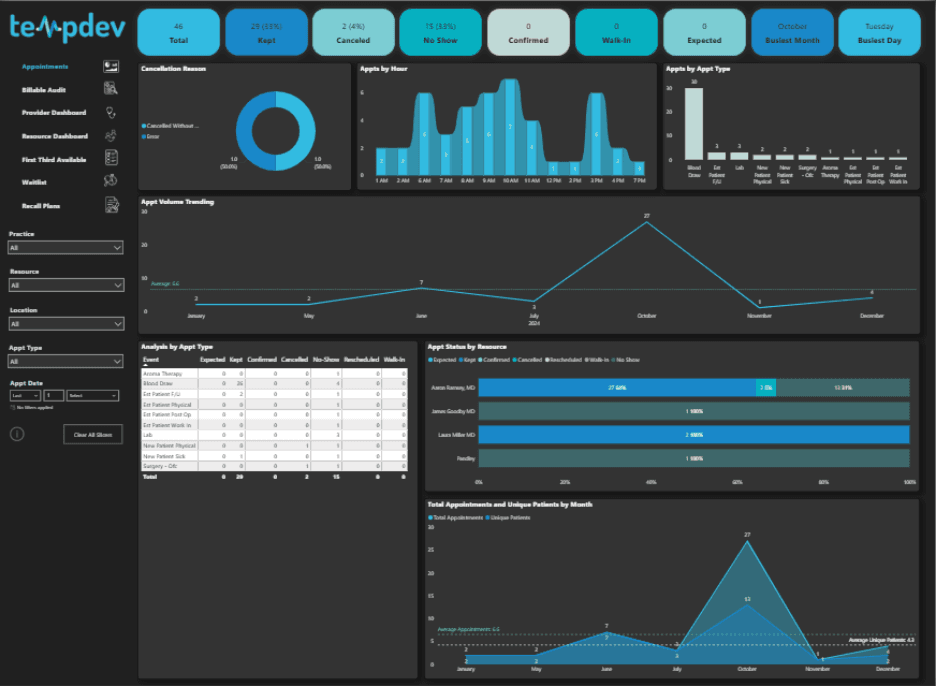 TempDev’s Appointment Analysis BI Dashboard consolidates complex scheduling data into intuitive visuals and KPIs. Executives, practice managers, and physicians can instantly spot where opportunities—and risks—exist.