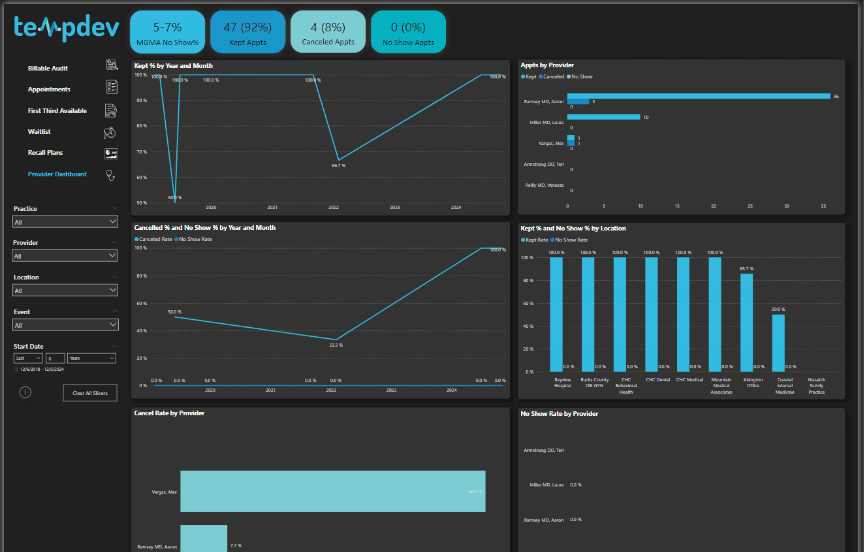 One multi-location practice uncovered that Mondays had the highest no-show rates. With TempDev’s Appointment Analysis Dashboard, they restructured recall efforts and filled gaps with waitlist patients. Within one quarter, they reduced no-shows by 20%—a direct lift in revenue and improved patient satisfaction.